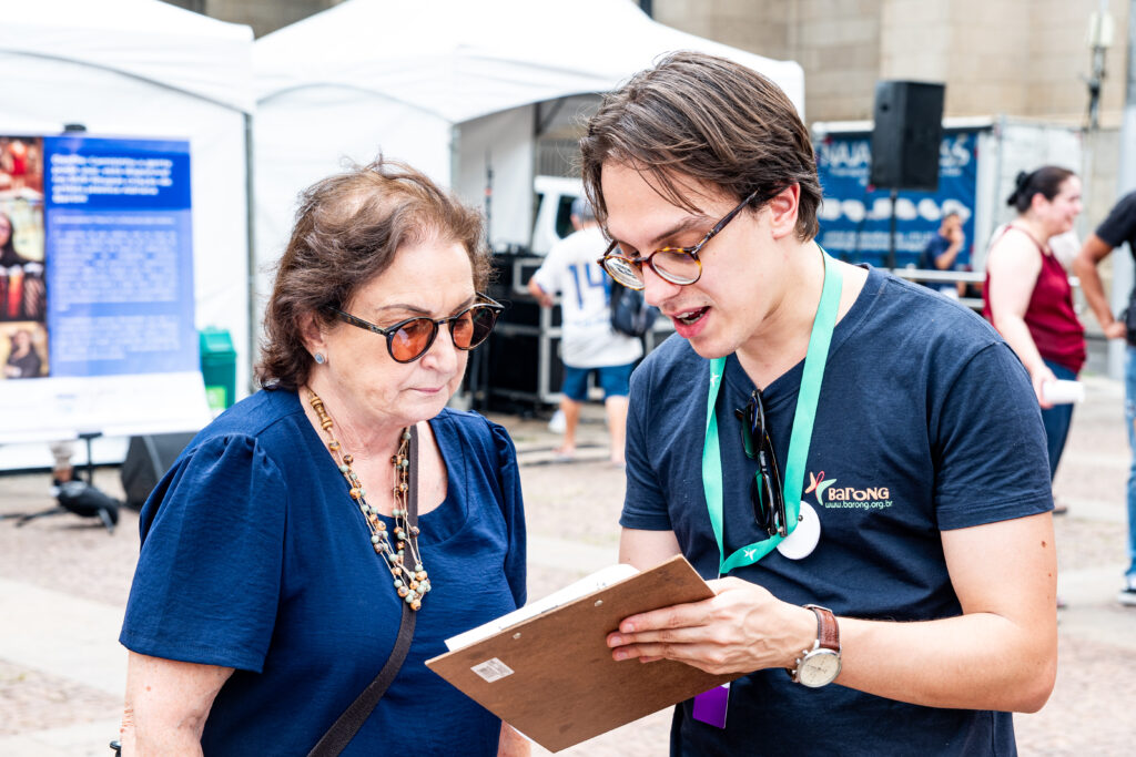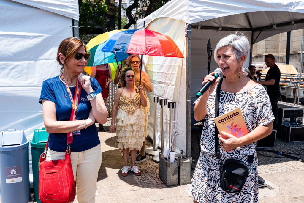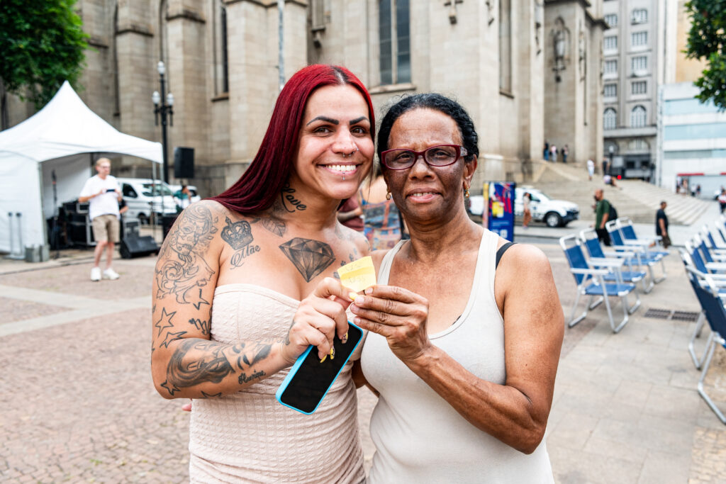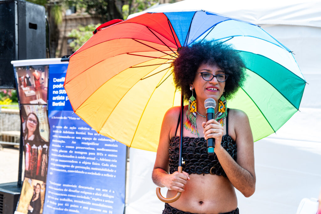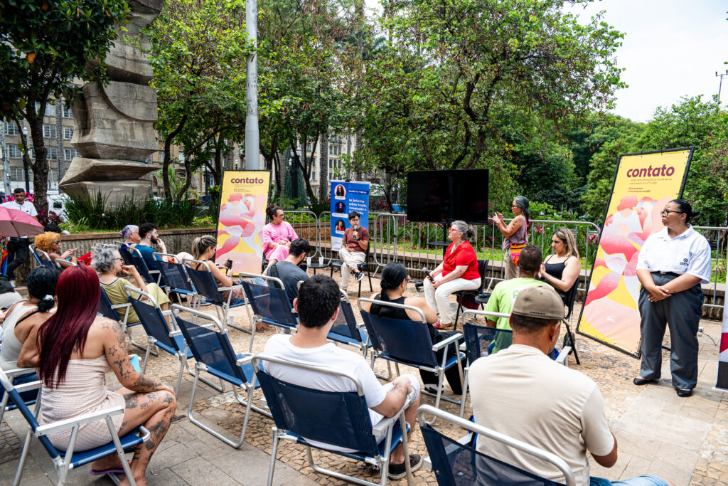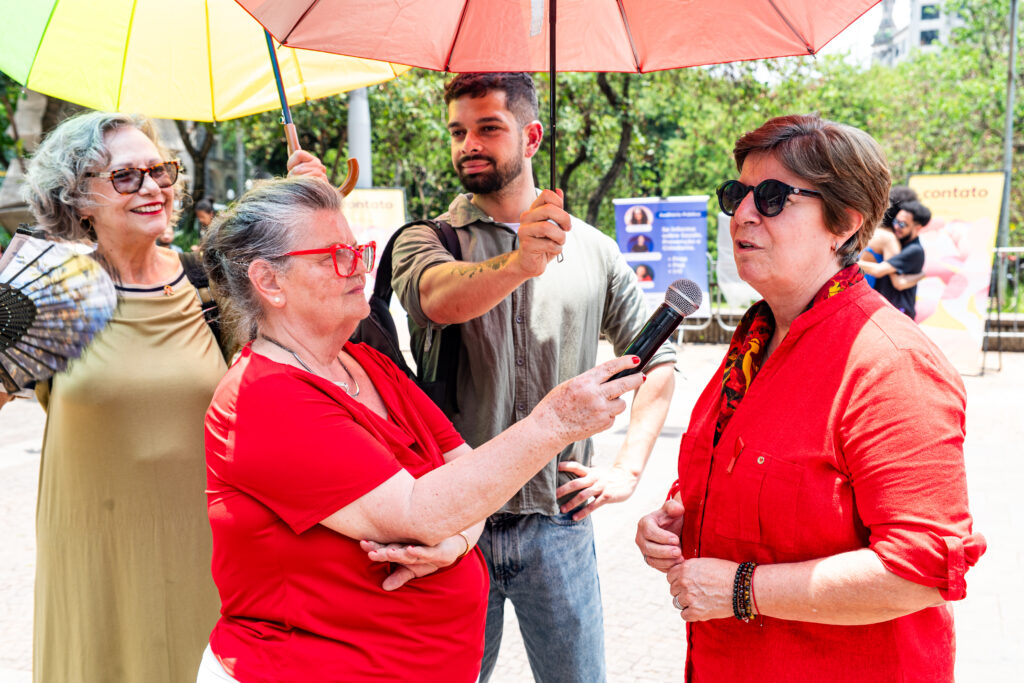 Um dos momentos mais interativos da programação foi o auditório público, instalado ao ar livre, em plena Praça da Sé. Todas as pessoas puderam sentar, ouvir, perguntar, compartilhar e aprender com a ativista Guggãa Taylor e a Dra. Mafê Medeiros, infectologista.