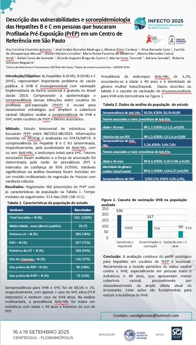 Outro pôster em destaque é de autoria da dra. Ana Caroline Coutinho Iglessias, dr. José Valdez Ramalho Madruga, dr. Mateus Ettori Cardoso e equipe do CRT DST/Aids e da Unifesp. O estudo analisou 502 prescrições de PrEP entre agosto de 2022 e agosto de 2024, oferecendo um retrato atualizado da situação sorológica dessa população em relação às hepatites B e C.
