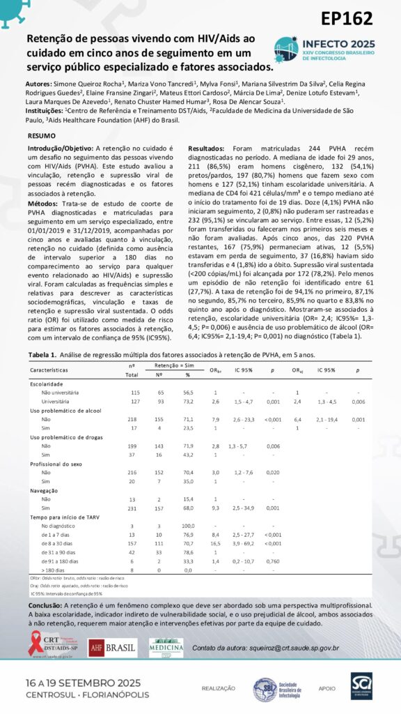 Entre conferências e mesas redondas, os pôsteres científicos chamam atenção pela capacidade de traduzir evidências recentes em práticas que podem impactar diretamente o atendimento da população. Três trabalhos apresentados em Florianópolis trazem informações sobre retenção no cuidado de pessoas vivendo com HIV/aids e prevenção de hepatites virais em usuários de PrEP (profilaxia pré-exposição ao HIV).