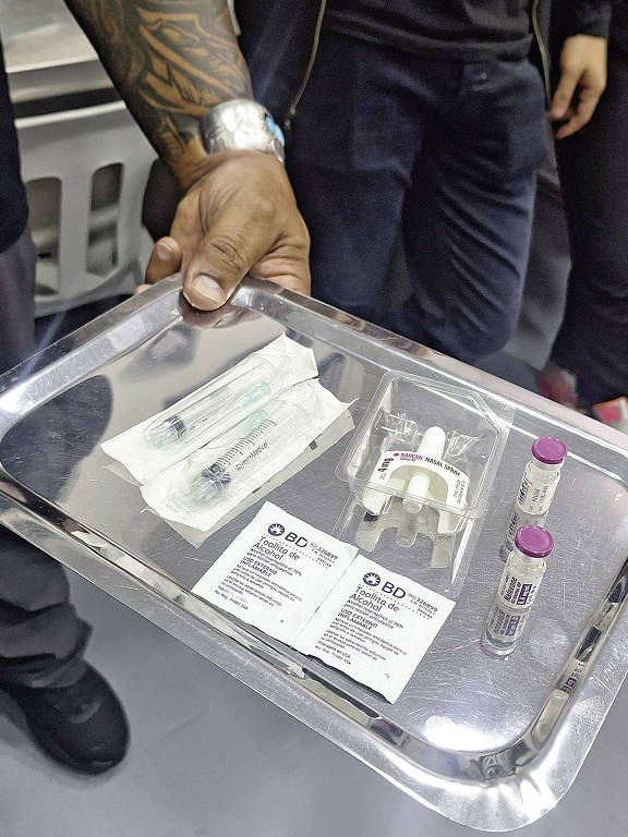 Usuário de droga injetável segura bandeja com seringas e materiais em sala de uso monitorado em Bogotá, Colômbia – Cláudia Collucci/Folhapress