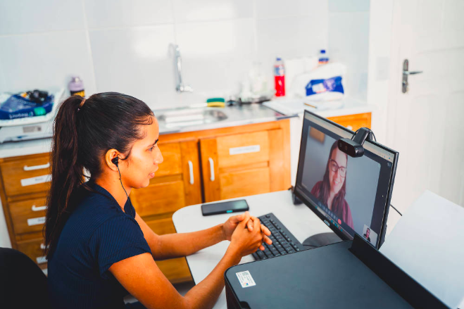 Mulher sentada em frente a computador em cozinha, participando de videoconferência com outra mulher visível na tela. Ela usa fones de ouvido e está concentrada na conversa. Ao fundo, armários de madeira, pia e utensílios de cozinha.Mulher sentada em frente a computador em cozinha, participando de videoconferência com outra mulher visível na tela. Ela usa fones de ouvido e está concentrada na conversa. Ao fundo, armários de madeira, pia e utensílios de cozinha.