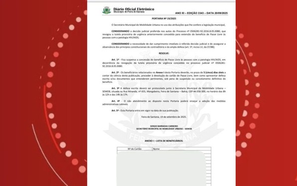 A Prefeitura de Feira de Santana, segunda maior cidade da Bahia, publicou uma lista com nomes de mais de 600 pessoas que vivem com HIV no município, no Diário Oficial de sábado (20), ao decretar a suspensão do benefício de passe livre no transporte coletivo urbano. A edição do documento foi retirada do ar horas depois.
