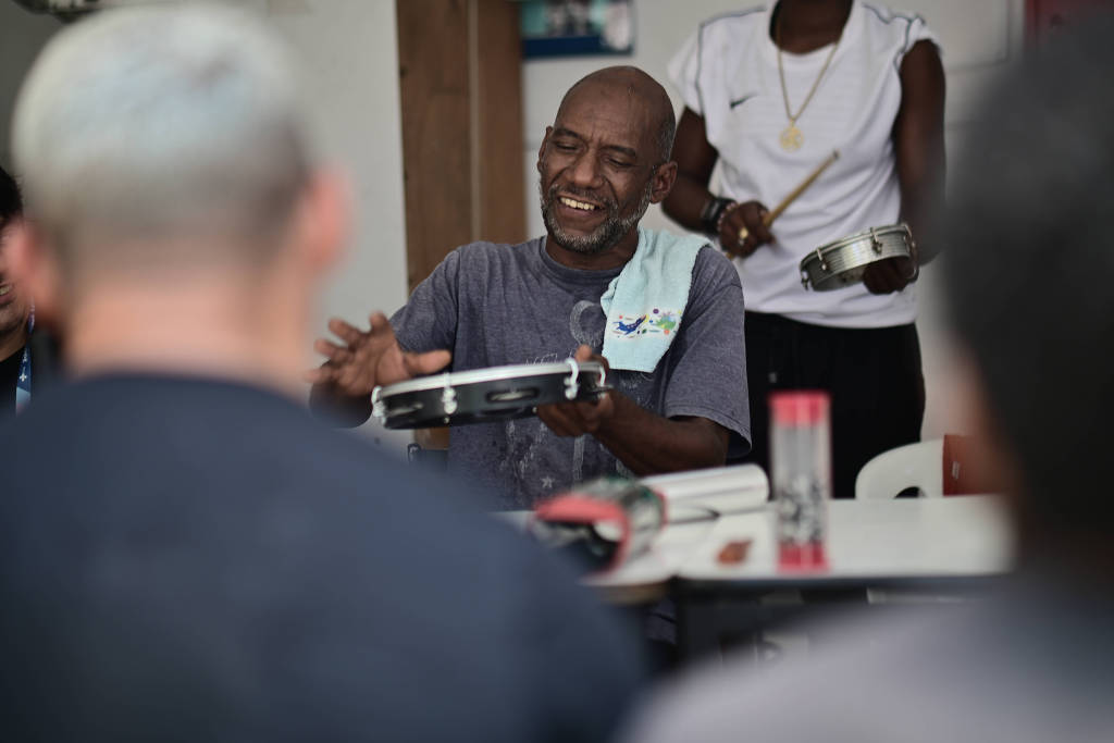 Homem sorridente toca pandeiro sentado em ambiente interno, com toalha no ombro. Outra pessoa ao fundo também segura pandeiro, enquanto duas pessoas estão desfocadas em primeiro plano.Homem sorridente toca pandeiro sentado em ambiente interno, com toalha no ombro. Outra pessoa ao fundo também segura pandeiro, enquanto duas pessoas estão desfocadas em primeiro plano.