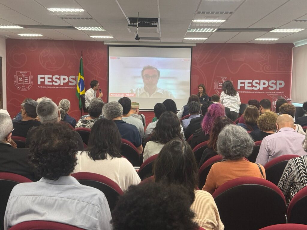 O professor Fernando Aith, que participou virtualmente do evento, trouxe uma reflexão sobre a necessidade de regulação estatal para garantir que a transformação digital ocorra em benefício da sociedade.