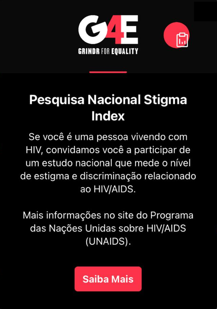 No último domingo (01), o Unaids, em parceria com o Grindr, iniciou inserções no aplicativo de relacionamento, incentivando a participação das pessoas usuárias da plataforma na pesquisa Índice de Estigma (Stigma Index, em tradução para o inglês).
